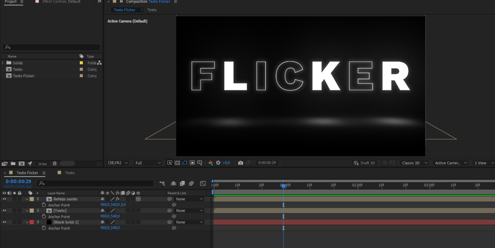 Proyecto de After Effects (1920 x 1080) con una revelación de texto con efecto flicker y reflejo. El texto se puede editar para cambiar la animación.
